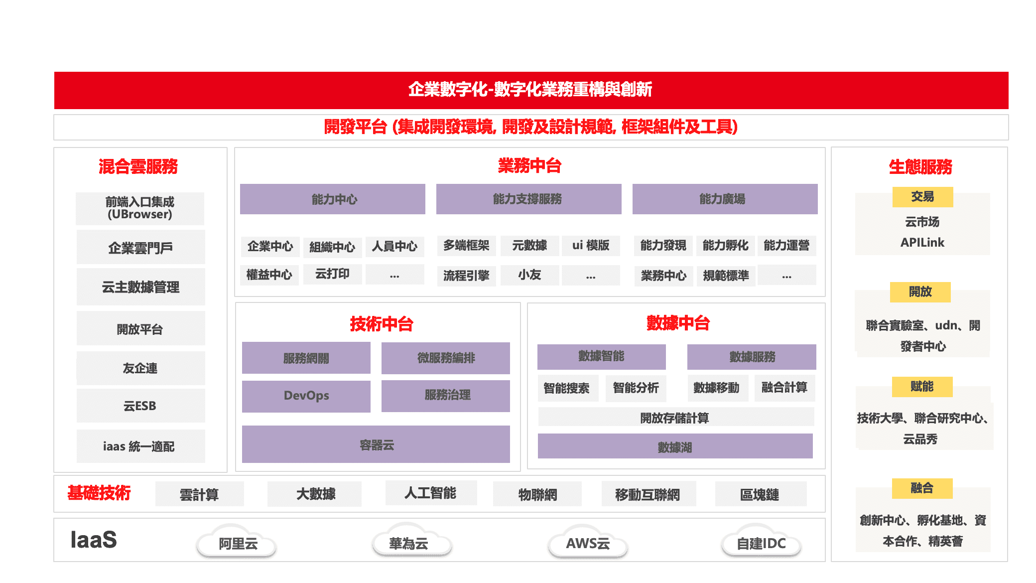 中台不是簡單“業務中心”的集合和包裝,而是基於統一能力框架(UCF)的產品及服務重構,體現了數字化時代業務創新的關鍵要素,如微服務架構,統一數字化建模,數據驅動,智能嵌入,運營導向,混合雲集成,國際化等等。