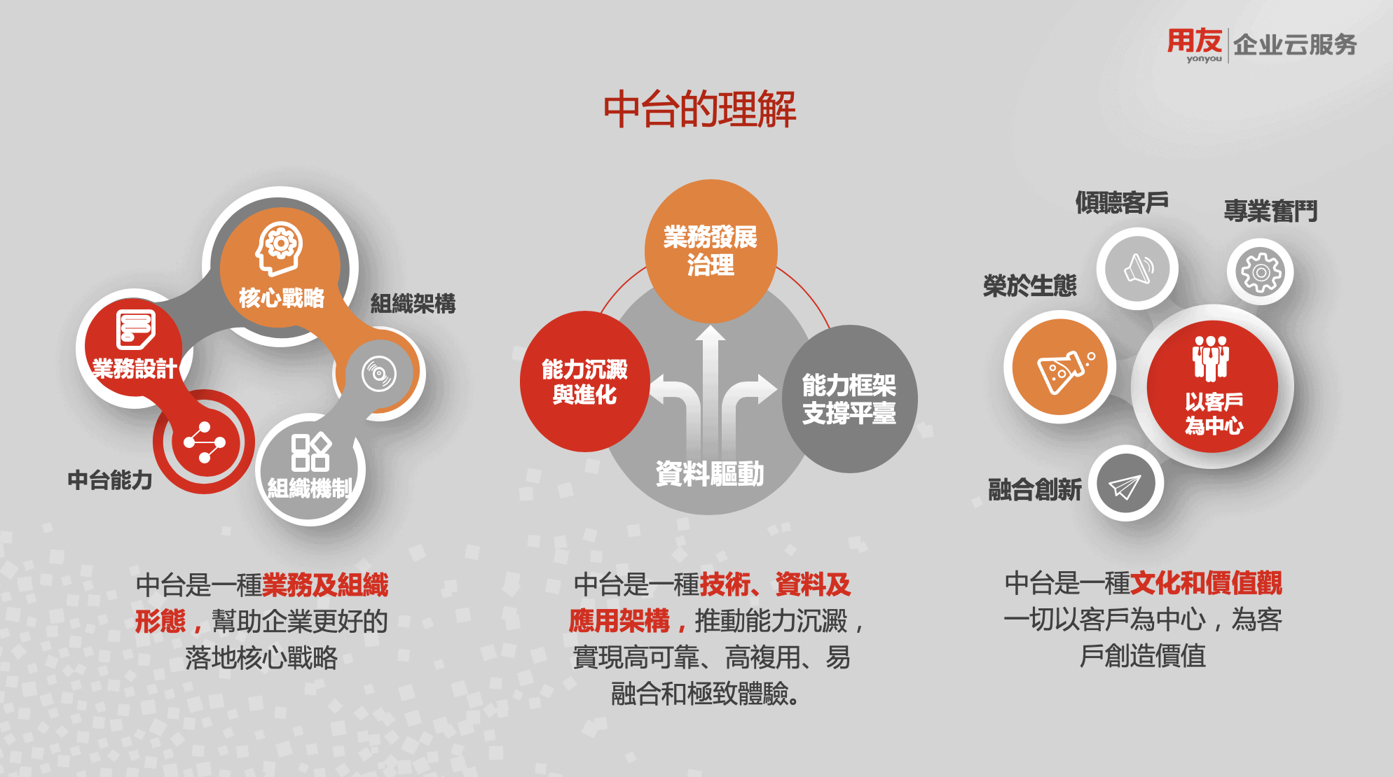 用友網絡助理總裁 羅小江先生指岀業務中台是基於技術中台構建的,提供企業應用的基礎建模和強大的平臺擴展能力,與數據中台的資料服務一起支撐企業雲應用建設。同時,與iuap的混合雲服務一起,連同用友雲與NC/U8等ERP產品,為企業提供混合雲整體解決方案。用友的生態夥伴或企業自身,皆可以基於業務中台,通過用友的開發平臺,實現生態產品和擴展開發。